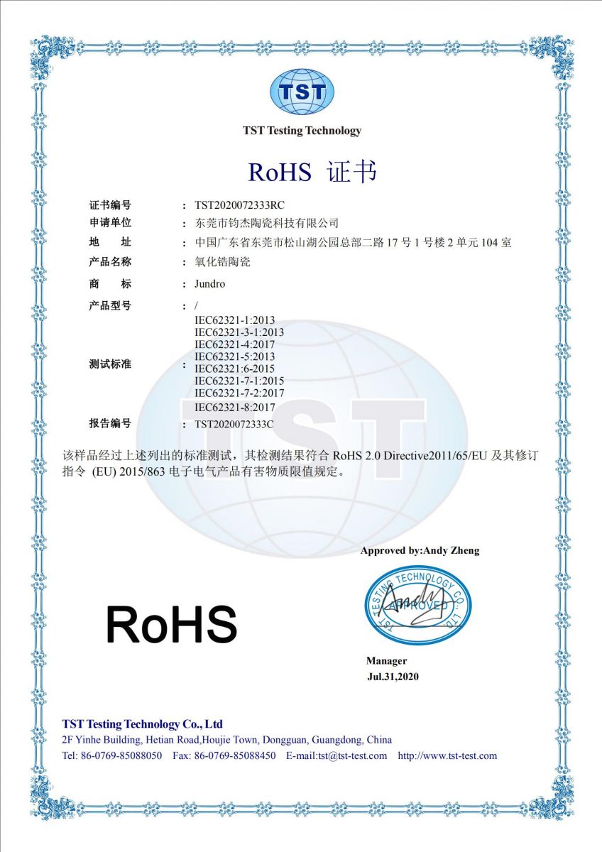 鈞杰陶瓷生產(chǎn)的氧化鋯陶瓷通過ROHS認(rèn)證,歡迎來電洽談,聯(lián)系電話:13412856568。